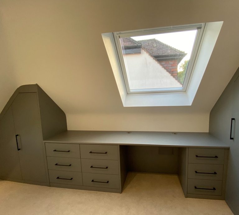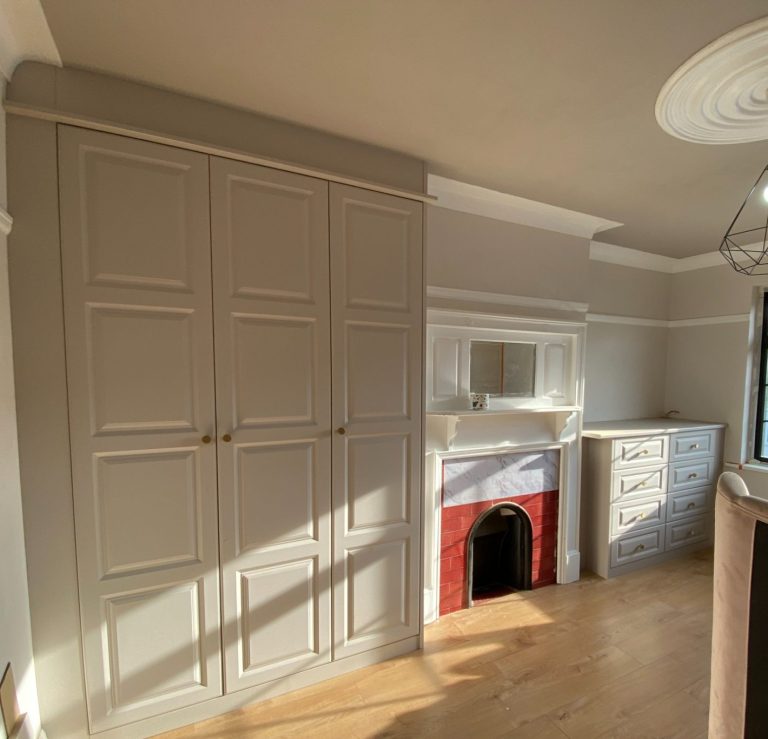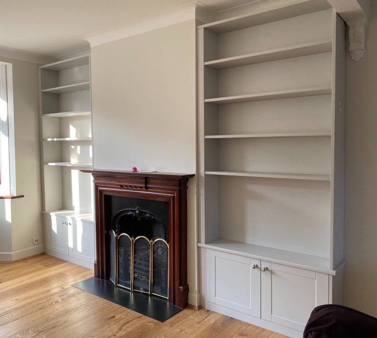 The doors and drawer front were 25mm thick. This helps to make the shaker style more pronounced and pleasing to the eye. the MDF was hand finished on site in Little Greene, coloured matched to the customers existing trim work.