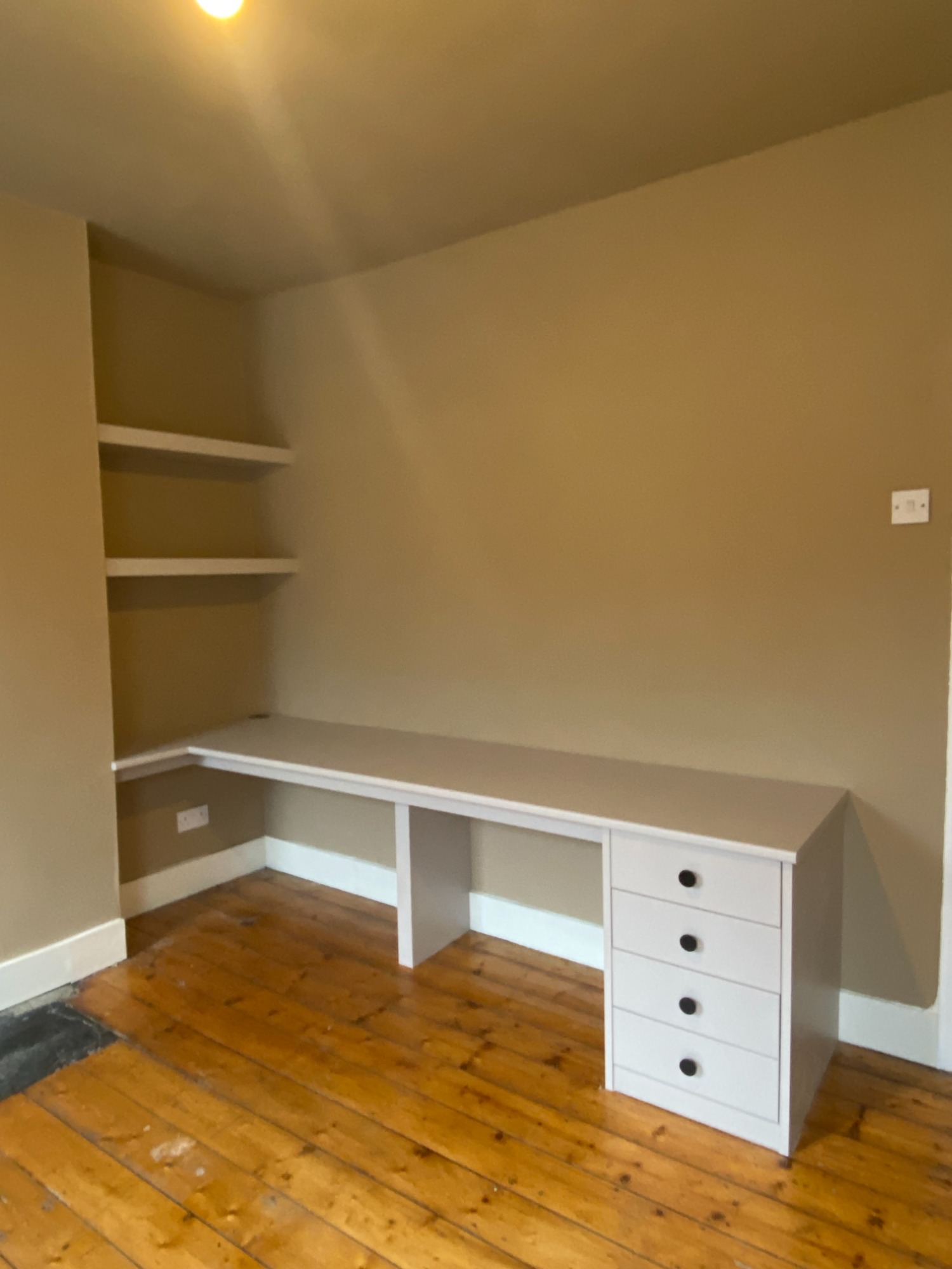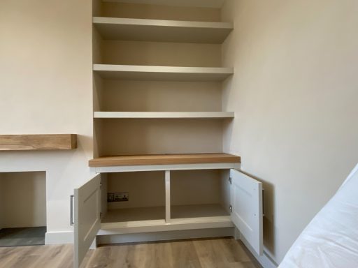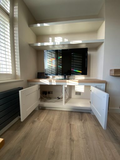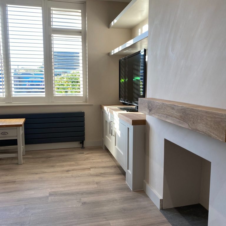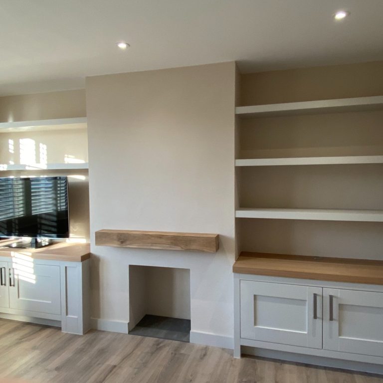 The was no back panel fitted to the units so as to allow access to the various points on the wall. therefore, they had to scribbed back neatly to the wall. The floating shelves are at the same height, less one to allow for the TV to fit underneath. For the doors, the customer asked for them to be the same size on both units. As the gaps were different either side, for the left hand unit we made two panels to match the style of the units.